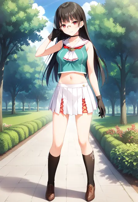 默认服装:choukaidefkc,蓝色水手服,红色领巾,短上衣,白色水手领,无袖,黑色手套,肚脐,腹部,白色裙子,迷你裙,百褶裙,黑色袜子,棕色鞋子