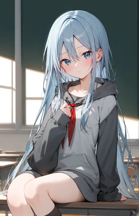 kanade-ng,gradient clothes,hood down,grey hoodie,long sleeves,hoodie,sleeves past wrists,red neckerchief,two-tone neckerchief,drawstring,black socks,