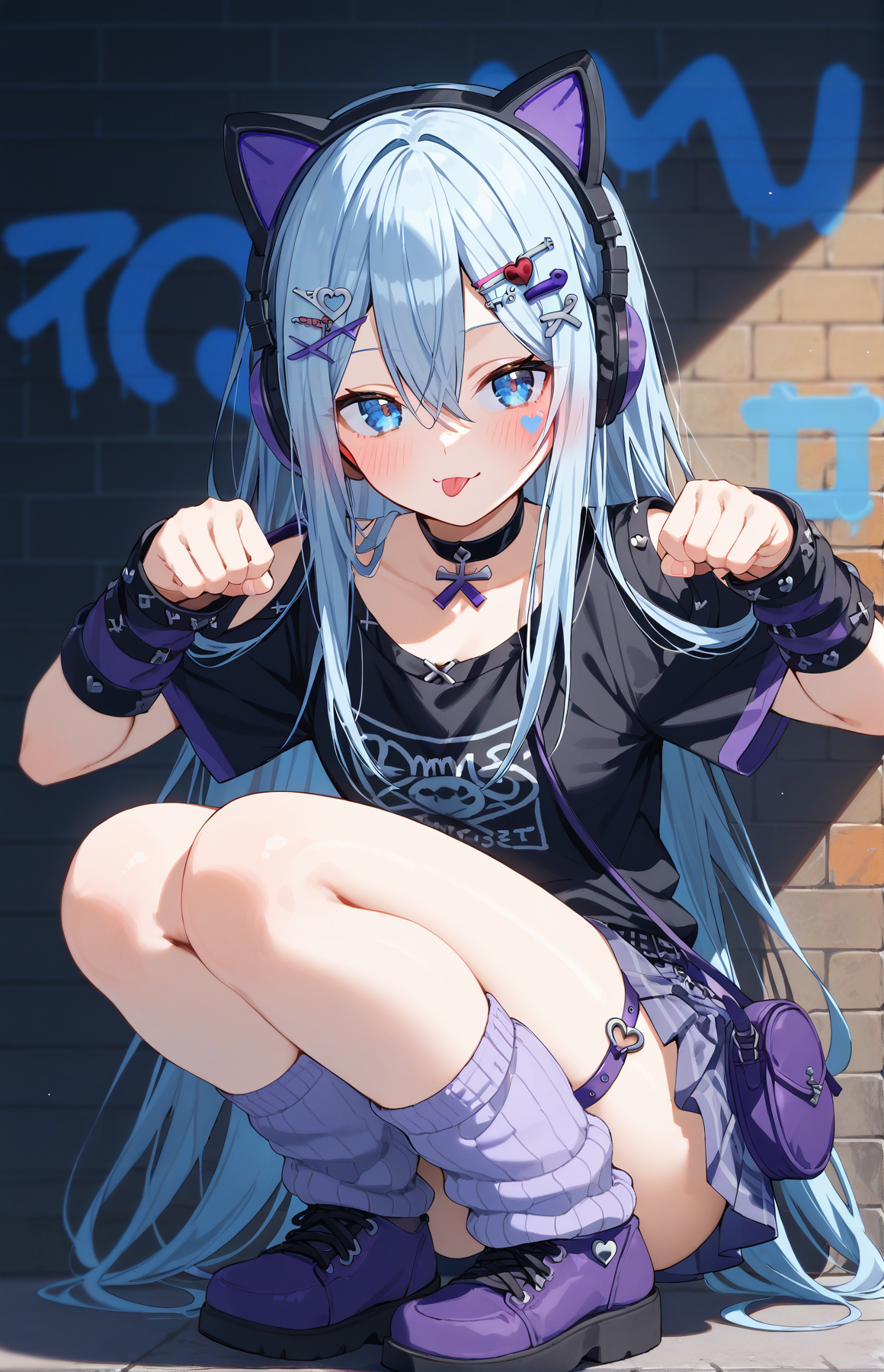kanade-neko,cat ear headphones,headphones,skirt,shirt,black choker,hair ornament,choker,shoulder cutout,black shirt,clothing cutout,bag,loose socks,purple socks,thigh strap,arm warmers,heart hair ornament,x hair ornament,purple footwear,leg warmers,cross-laced legwear,short sleeves,hairclip,cross-laced clothes,cross-laced sleeves,purple skirt,pleated skirt,heart,heart facial mark,
