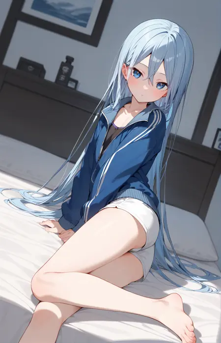 kanade-base,track jacket,blue jacket,black shirt,long sleeves,sleeves past wrists,barefoot,collarbone,white shorts,short shorts,