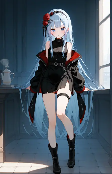 kanade-zzt,bare shoulders,black belt,black footwear,black hairband,black shirt,boots,collared shirt,dress,hair flower,hair ornament,hairband,jacket,knee boots,long sleeves,off shoulder,sleeveless shirt,thigh strap,belt,high collar,black jacket,red rose,black skirt,pencil_skirt,