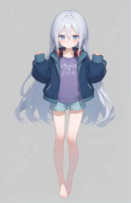 kanade-base,track jacket,blue jacket,black shirt,long sleeves,sleeves past wrists,barefoot,collarbone,white shorts,short shorts,