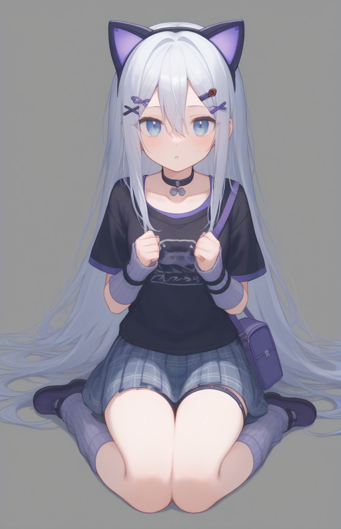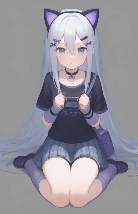 kanade-neko,cat ear headphones,headphones,skirt,shirt,black choker,hair ornament,choker,shoulder cutout,black shirt,clothing cutout,bag,loose socks,purple socks,thigh strap,arm warmers,heart hair ornament,x hair ornament,purple footwear,leg warmers,cross-laced legwear,short sleeves,hairclip,cross-laced clothes,cross-laced sleeves,purple skirt,pleated skirt,heart,heart facial mark,