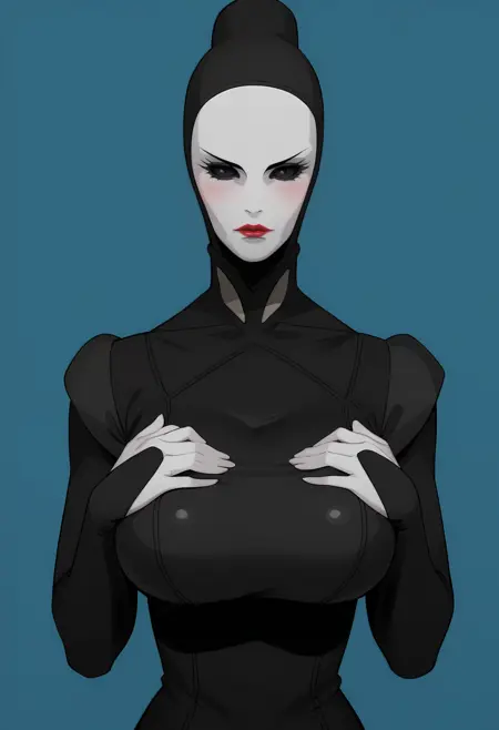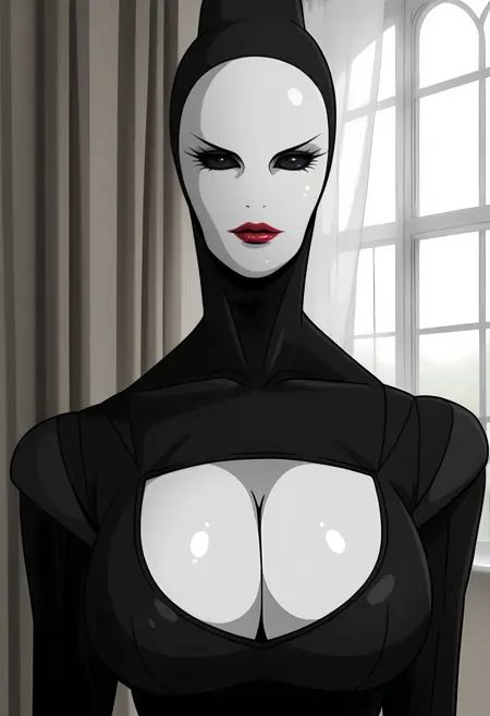 1girl, breasts, black eyes, eyelashes, lips, lipstick, makeup, mask, dress, black dress, bodysuit