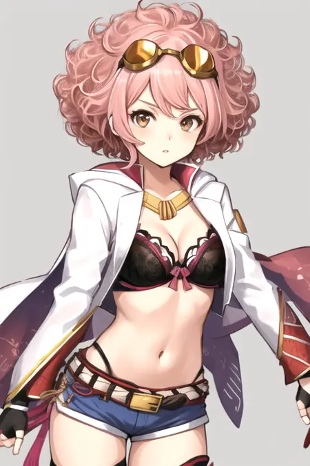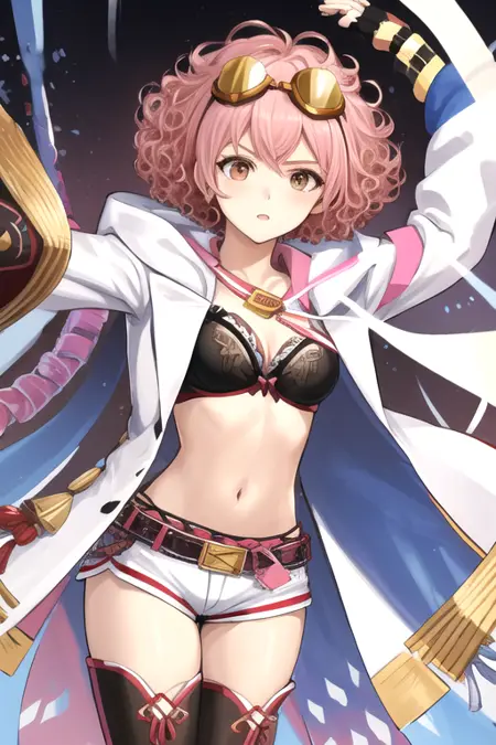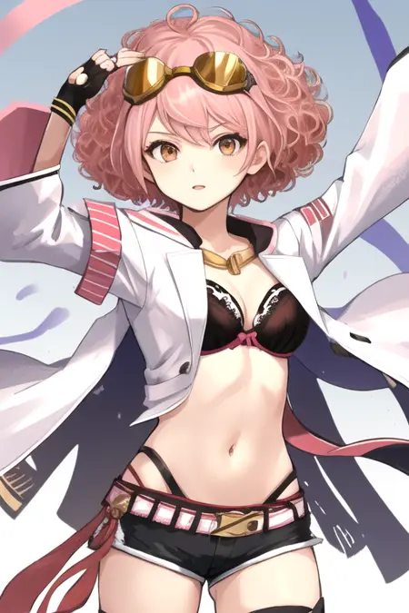 KoshoshoSW, 1girl, solo, short hair, thighhighs, fingerless gloves, navel, cleavage, brown eyes, medium breasts, pink hair, midriff, short shorts, curly hair, goggles on head, afro, white coat, open coat, black bra