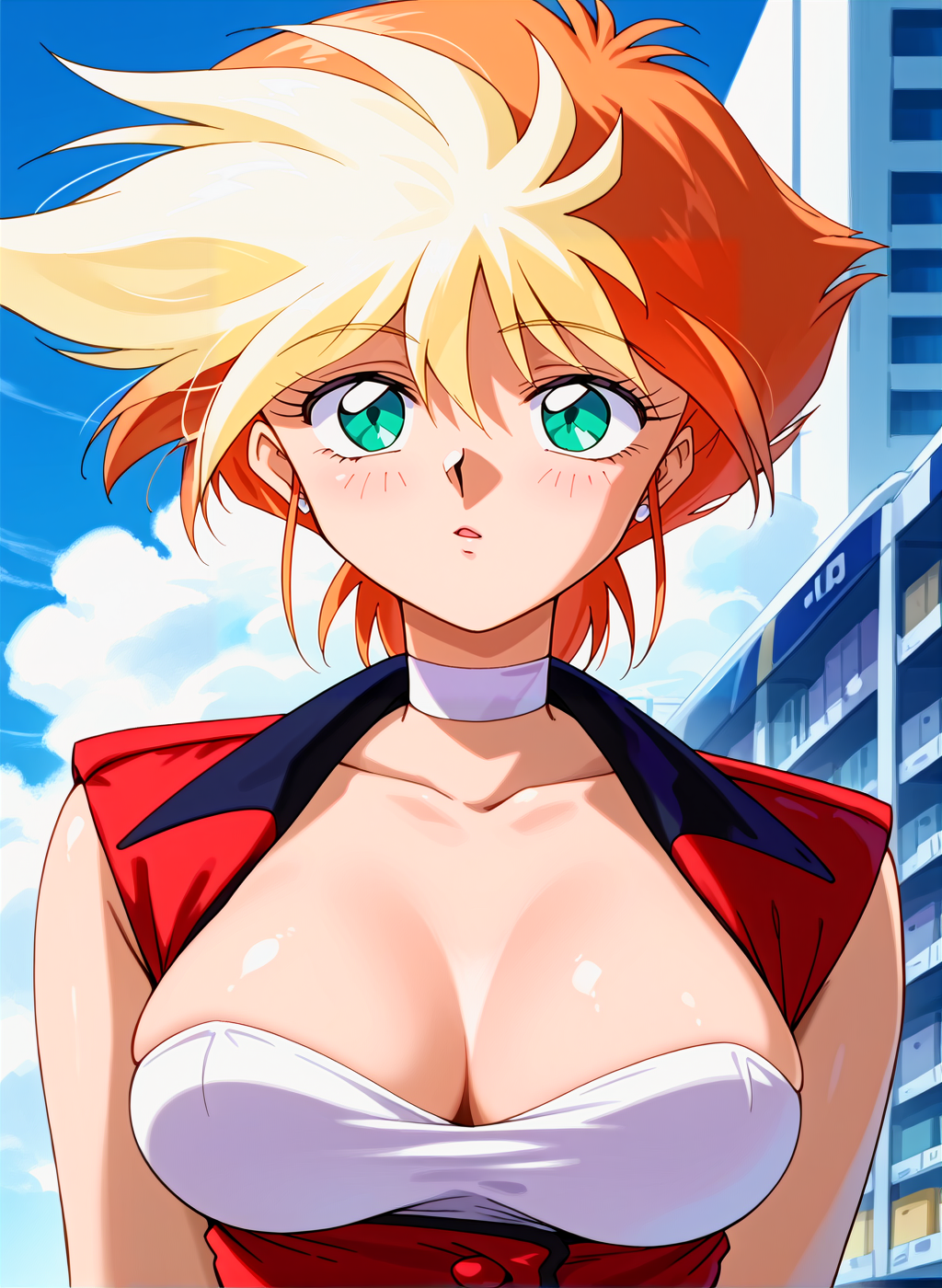 kei \(dirty pair flash\), dirty pair flash, 오렌지색 머리, 금발, 다색 오렌지색 머리, 단발, 초록색 눈, 큰 가슴, 염색한 앞머리