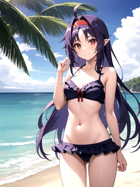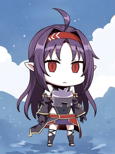 주요 복장: yuukibase, 보라색 머리카락, 긴 머리카락, 아호게, 빨간 눈, 예리한 귀, 머리띠, 갑옷, 가슴 거攻关, 분리형 소매, 레오타드, 보라색 치마, 어깨 노출, 장갑
