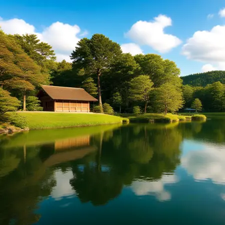 The fishing pavilion is a part of the architectural style found in residences of the aristocracy during the Heian period, characterized by its structure facing a body of water. This building was used as a place to appreciate the beautiful scenery of the garden or pond, designed to be well-ventilated and to harmonize with the surrounding nature. It features an open space on all sides, connected by verandas and corridors, allowing for views of the natural surroundings.