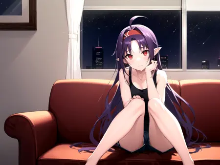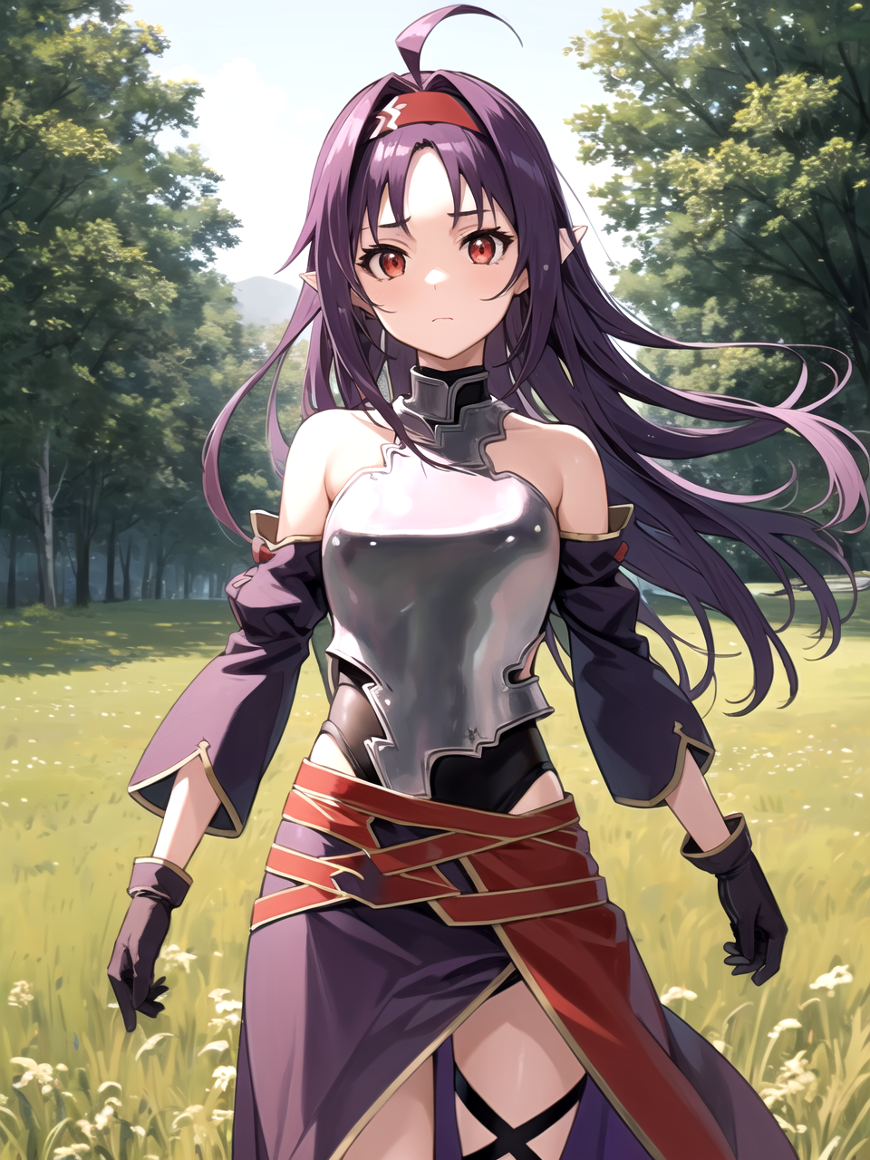 Main Outfit: yuukibase, purple hair, long hair, ahoge, red eyes, pointy ears, hairband, armor, breastplate, detached sleeves, leotard, purple skirt, bare shoulders, gloves