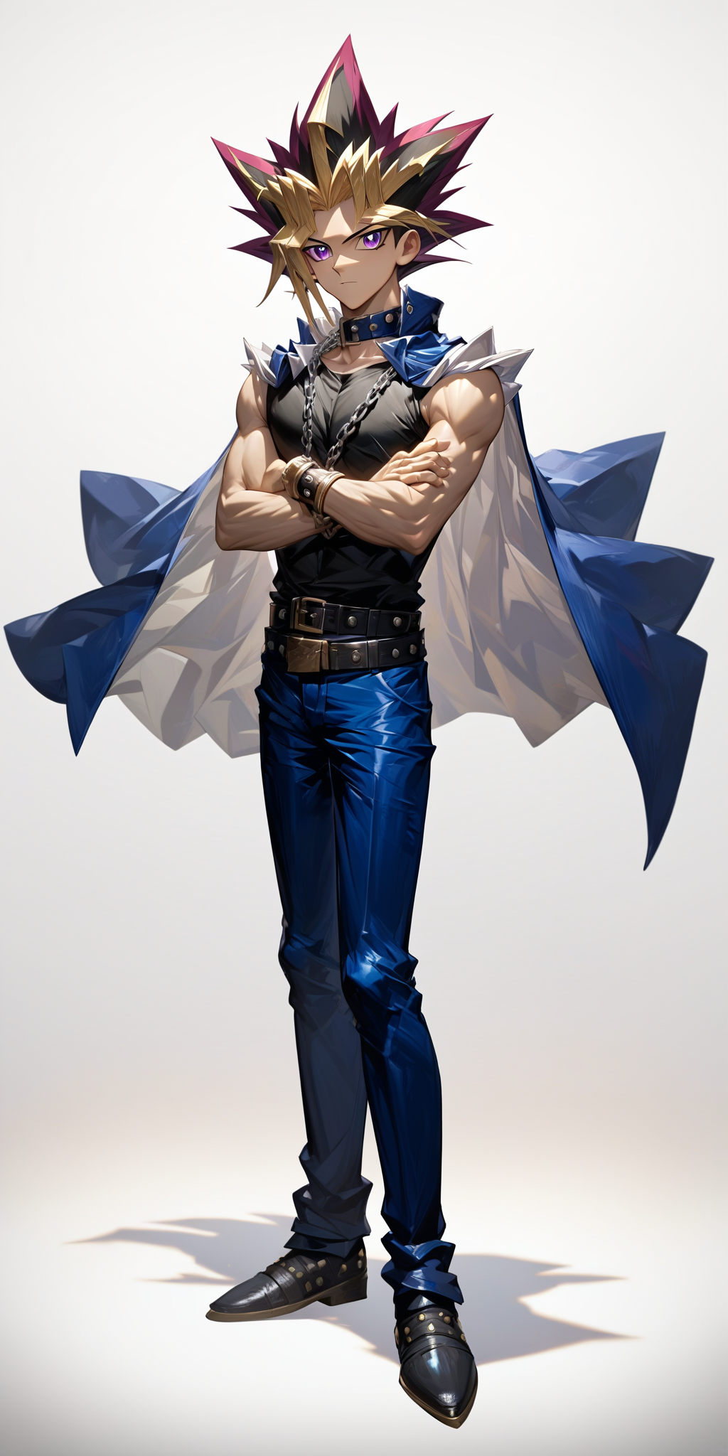 yami yugi, 1boy, multicolored hair, dyed bangs, purple eyes