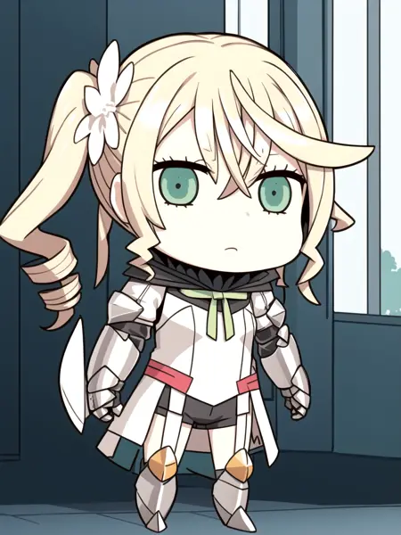 정장: adarmor, 금발, 측면부터 묶은 고리, 푸른 눈, 갑옷, 목 리본, 검정 색 반바지, 가터 스트랩, 장갑, 허벅지 운동화