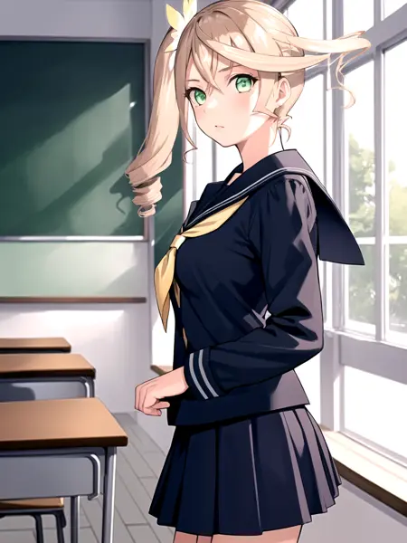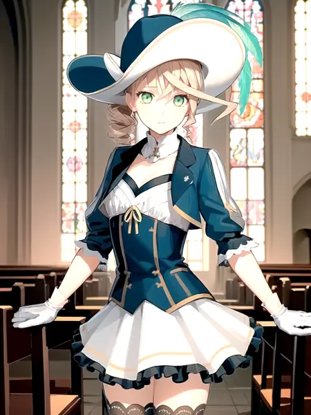 포멀웨어: adformal, 금발, 측면부터 묶은 고리, 푸른 눈, 드레스, 파란 자켓, 흰색 치마, 허벅지까지 오는 양말, 장갑, 모자, 모자 깃털