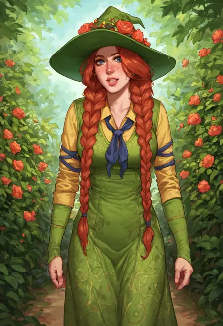 green hat, hat flowers, green dress, long sleeves, brown shoes,