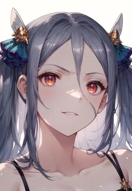Morpeah-AP、巨乳、赤い目、長い髪、ツインテール、額に髪が垂れ下がる、灰色の髪、ゴールドの耳当て、ブラックの露出トップ、ブラックのふわふわの長袖、ブライダルグローブ、白いサイドカットスカート、露出の多い衣装、ゴールドのジュエリー、
