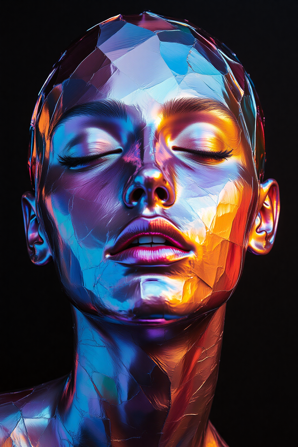 This is a highly detailed, ultra-realistic CGI photograph of the subject's skin covered with a shiny, metallic-colored film that reflects the light and creates a mesmerizing rainbow effect.
