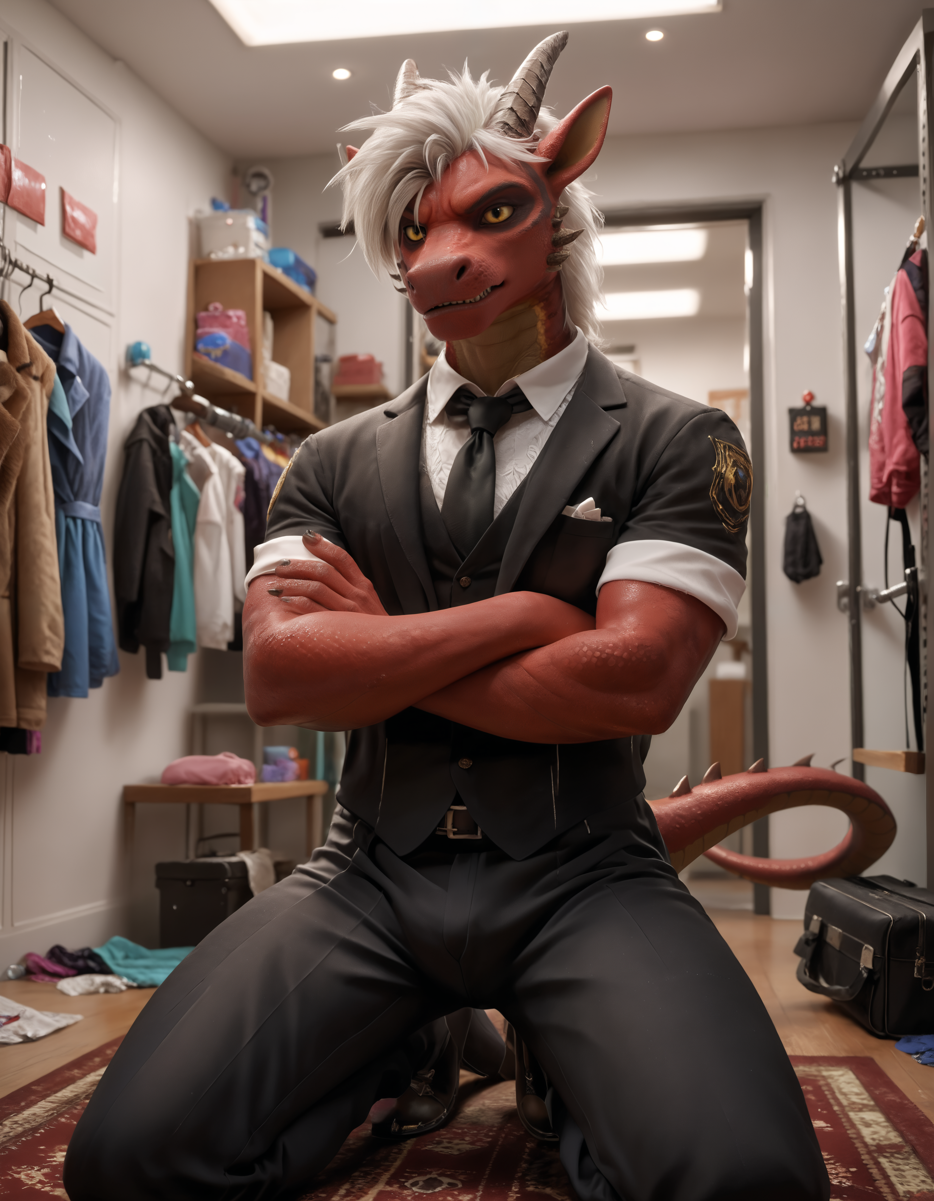 gariyuu, anthro, solo, male, 1boy, male focus, horns, abs, red body, dragon, muscular, hi res, scalie, muscular male, tail, colored skin, red scales, white hair, looking at viewer, yellow eyes, black sclera, digitigrade