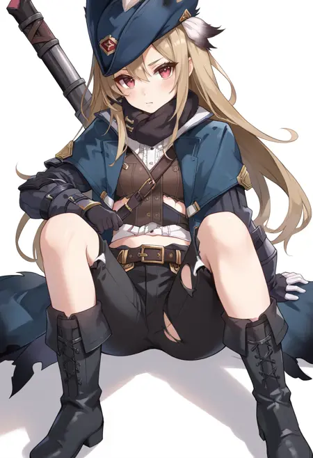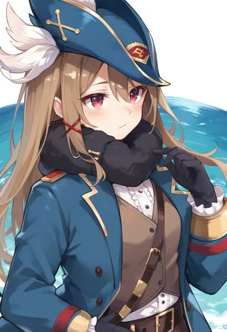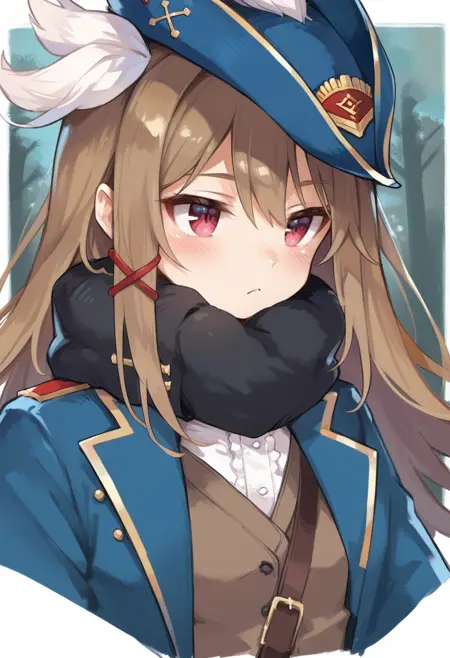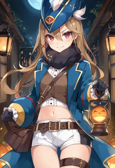 태그(옷 1): 파란 삼각모자, 한쪽 검은 허벅지 양말, 흰색 짧은 반바지, 검은 장갑, 갈색 무릎 부츠, 파란 코트, 빨간 X 모양 머리 장식, 검은 스카프
