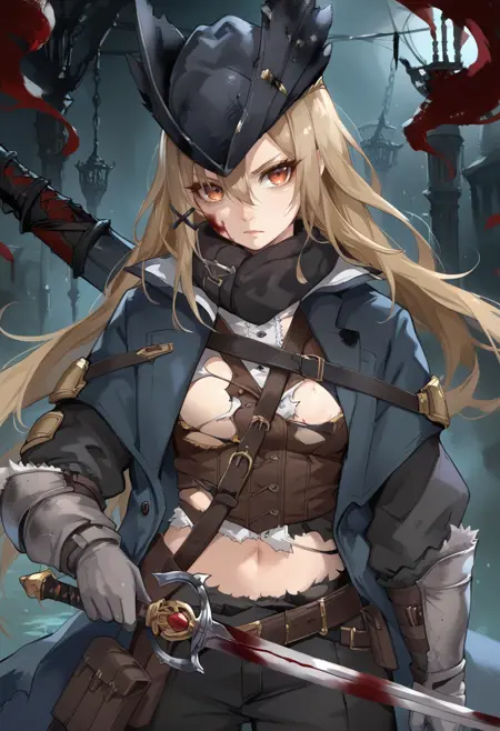 태그(옷 2): 검은 삼각모자, 한쪽 검은 허벅지 양말, 검은 바지, 회색 장갑, 검은 무릎 부츠, 검은 코트, 검은 X 모양 머리 장식, 검은 스카프, 찢어진 옷