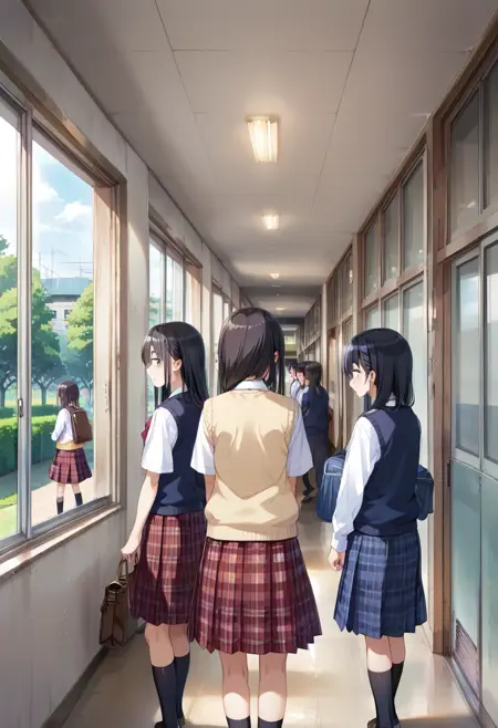 rouka, school, multiple girls, school uniform, skirt, window, hallway, indoors, black hair, scenery, from behind, tree, vest, plaid, sunlight, sweater vest, plaid skirt,