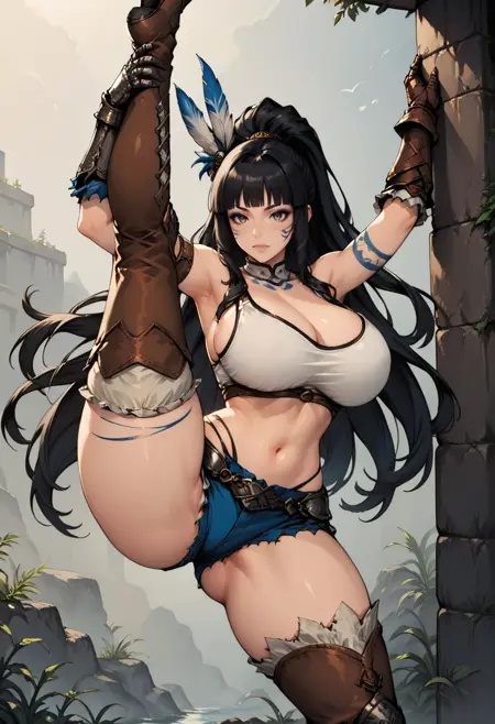 태그: 코리, 바바리안, 검은 머리, 긴 머리, 곧은 앞머리, 높은 포니테일, 물결 모양 머리, 사이드록, 파랑과 흰색 깃털 머리 장식, 털 망토, 흰색 텅셔츠, 복부, 찢어진 파란 반바지, 겐틀렛, 갑옷, 허벅지 부츠, 부족 문양 얼굴 문신, 가슴, 돌 도끼 들고, 갈색 목걸이, 팔밴드