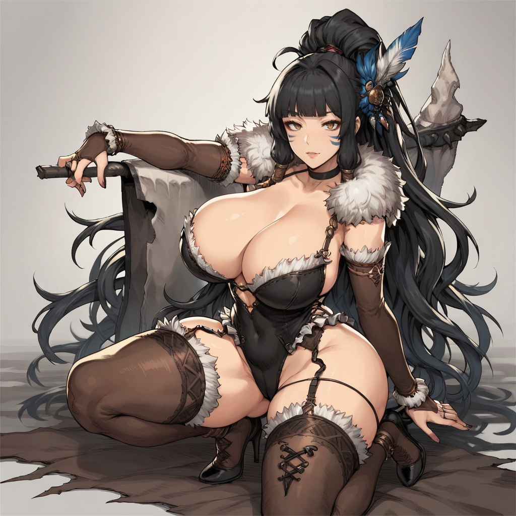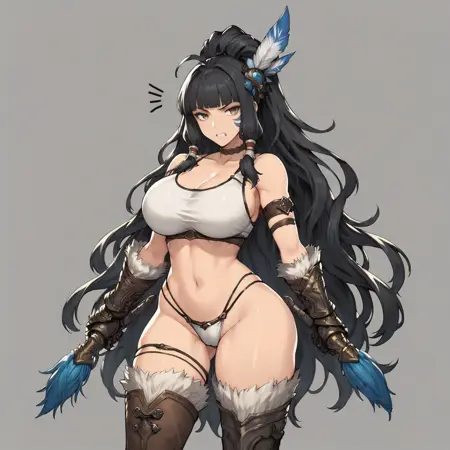 标签:Kaoli,野蛮人,黑发,长发,齐眉刘海,高马尾,波浪发,鬓发,蓝白羽毛发饰,毛皮斗篷,白色背心,露腹,破洞蓝色短裤,护腕,盔甲,过膝靴,部落面部纹身,胸部丰满,手持石斧,棕色项圈,臂环,