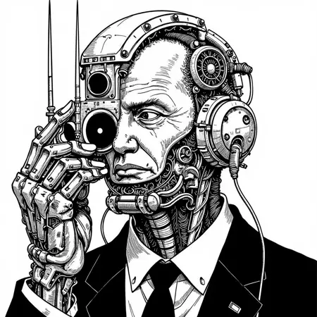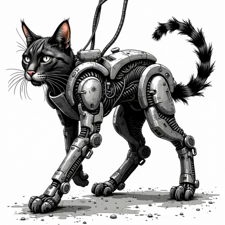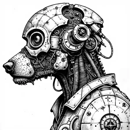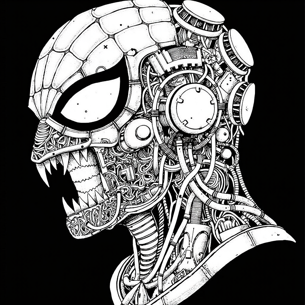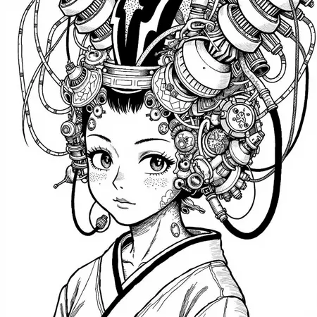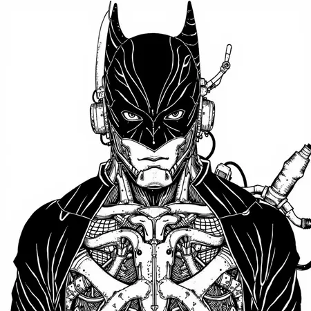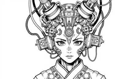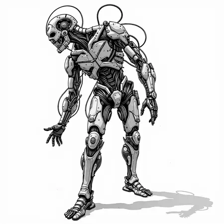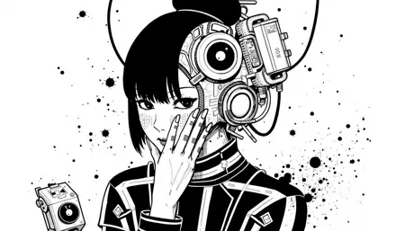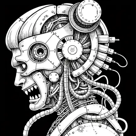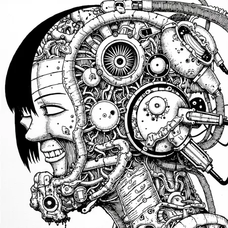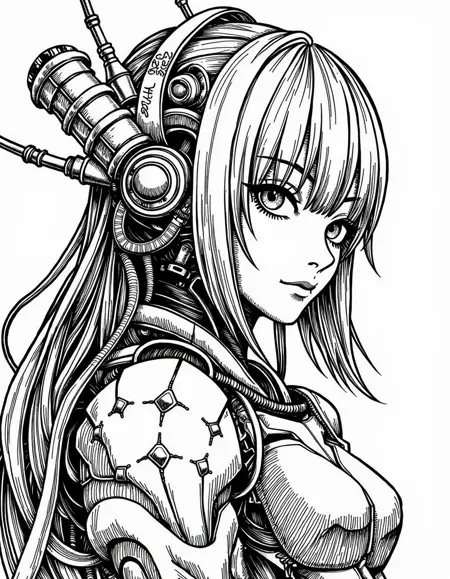 also: cyber, cyberpunk, cyborg, black and white digital drawing, manga