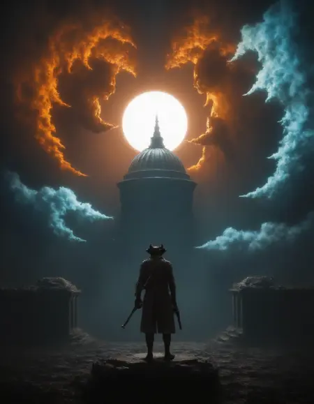 - Hunter stands in a mystical and foreboding scene, surrounded by colossal,