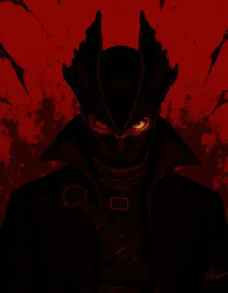 swirls around them. Their eyes glow with a fierce, almost demonic light, and