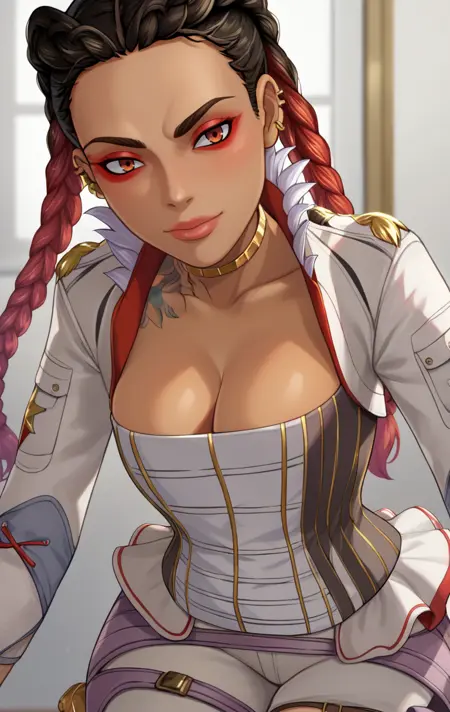 | 학습된 단어 | lobaXL,1girl,black hair,gloves,cleavage,brown eyes,jewelry,jacket,braid,red hair,multicolored hair,pants,dark skin,fingerless gloves,twin braids,dark-skinned female,gradient hair,makeup,white jacket,corset,tatto,eyeshadow,cropped jacket,white pants,hair behind ear,red eyeshadow,gold choker,wide hips복사됨! |