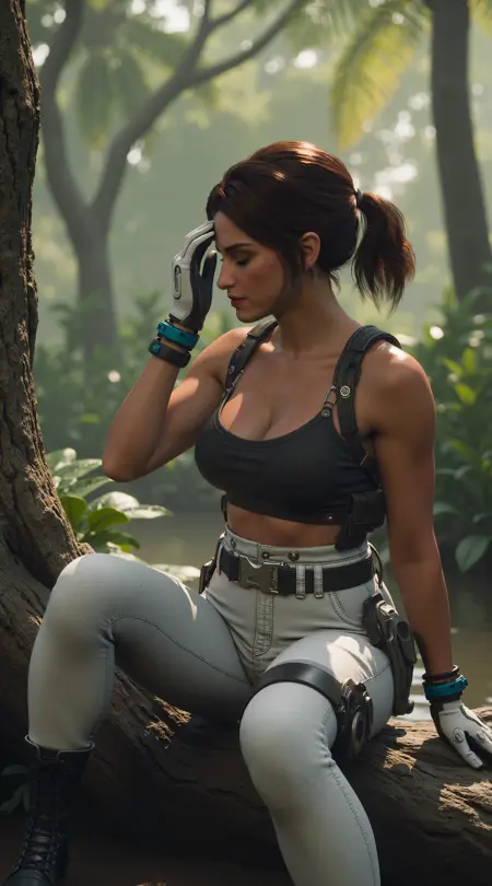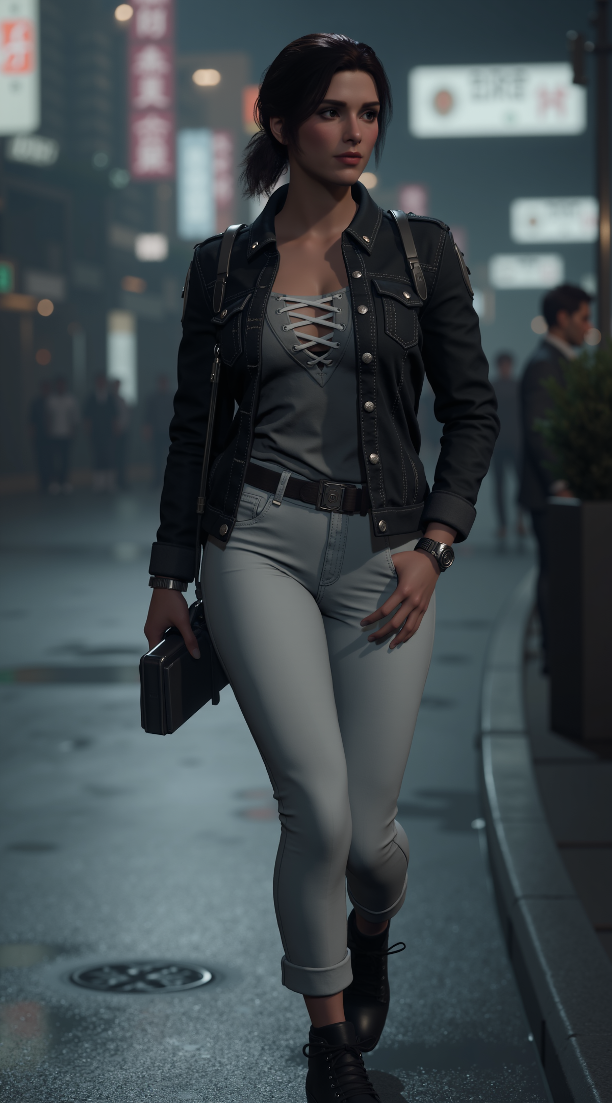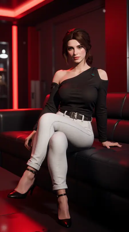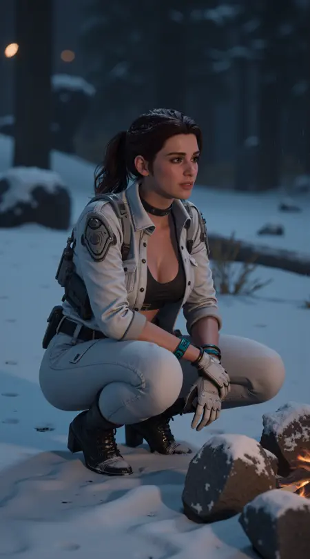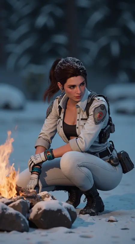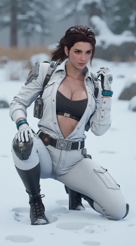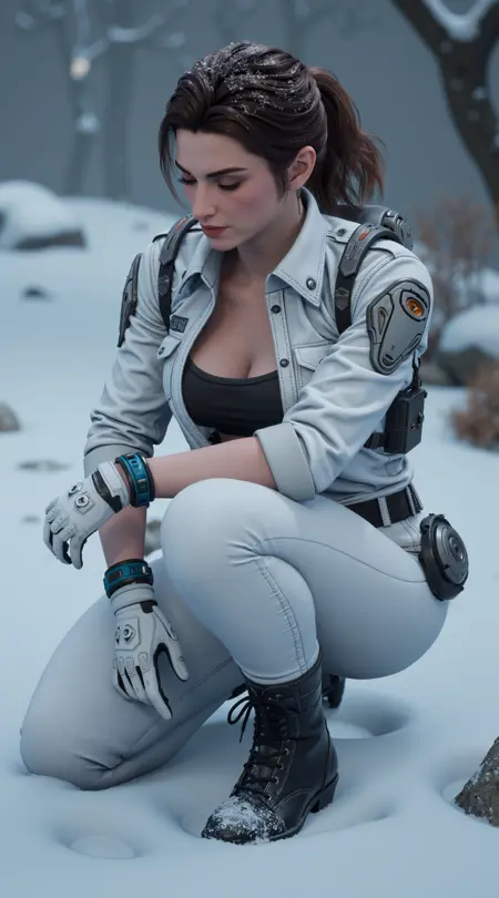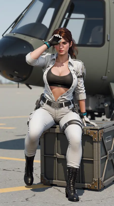 彼女は、未来型の戦術デザインを施した、ぴったりとフィットする白いハイテク軍用スーツを着用している。ジャケットはボタンで閉められているが、やや開いていて、その下には金属製の留め具付きの黒いスポーツブラが覗いている。ジャケットには肩パッドと複数のポケットが備わっている。スーツには、合成素材であることを示すわずかに光沢のある白いパンツが合わせられている。スーツはハイウエストデザインで、ヒップと太もものラインを強調している。