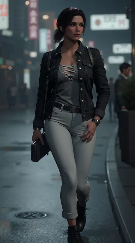 그녀는 미래적 전술 디자인을 가진 조임형 흰색 고기술 군복을 입고 있다. 이 복장은 단추로 단단히 잠긴 재킷으로, 아래에 금속 클립이 달린 검은 스포츠 브라가 살짝 드러나 있다. 재킷은 어깨 패드와 여러 개의 주머니를 가지고 있다. 복장은 약간 광택이 나는 합성 소재의 흰색 바지와 매치된다. 복장은 허리가 높게 디자인되어 엉덩이와 허벅지를 강조한다.