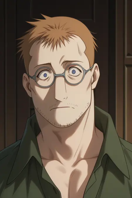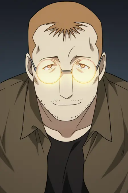 Shou Tucker, FMAShou, brown hair, short hair, grey blue eyes, facial hair, stubble, round glasses