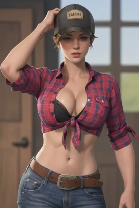 Outfit: freckles, hat, shirt, gloves, pants, tied shirt, denim