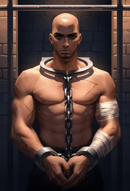 囚人:禿頭、上半身裸、手錠、鎖、刑務所の牢屋内