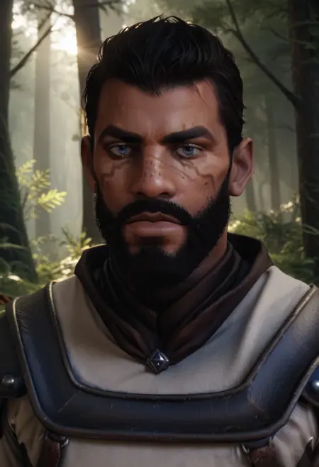 수염: 수염, 짧은 검은 머리, 어깨 갑옷, 흰색 및 갈색 투닉, 중세 도시, 성벽