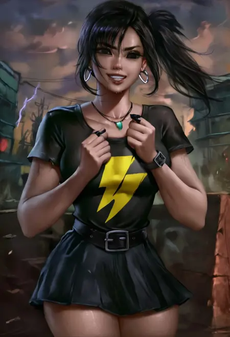 Knives Chau, 1girl, solo, short hair, black hair, jewelry, earrings, hoop earrings, necklace, lightning \(symbol\), black eyes, side ponytail, black shirt, t-shirt, skirt, belt