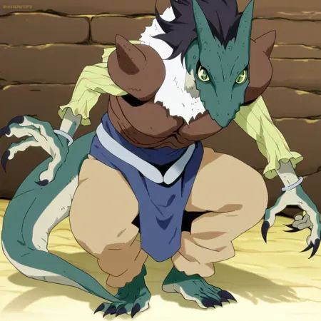 Illustrious tags: change "score_9", "source_anime", "wavy mouth" for "furry", "reptile boy", "jagged mouth"