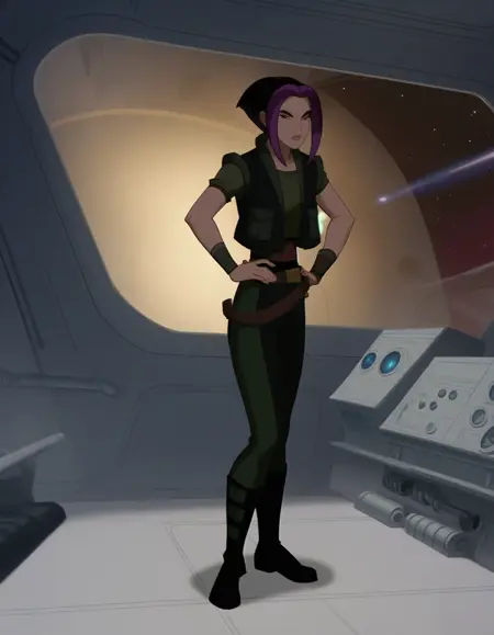 Outfit: vest, green shirt, asymmetrical sleeves, loose belt, pants, boots