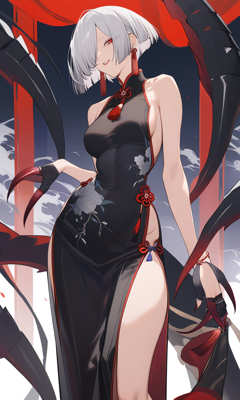 AKI, red eyes, white hair, mole, hair over eye, claws, black sandals, black dress, tassel earrings, backless dress, purple nails, hip slit, short straight bob hairstyle, kasa style cut, stylized Cheongsam dress, high cut, black with red edges, black pants