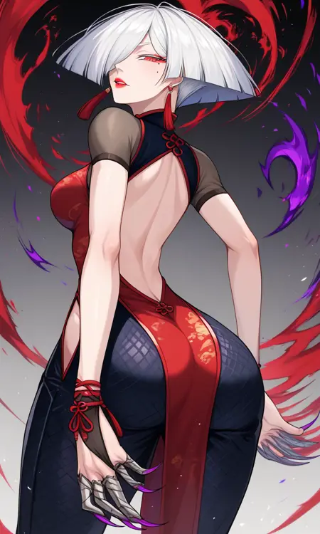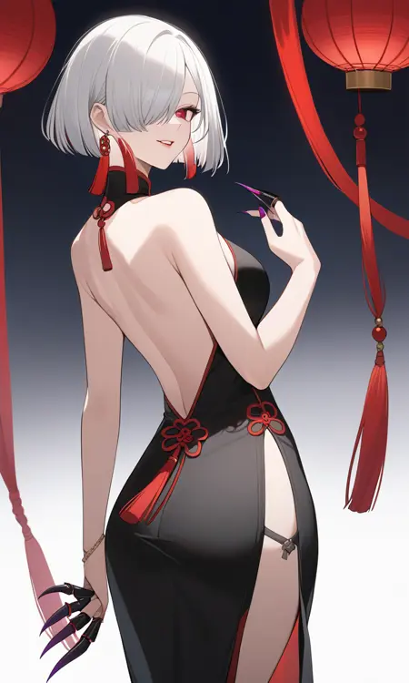 AKI,红眼睛,白发,痣,头发遮住眼睛,爪子,黑色凉鞋,黑色连衣裙,流苏耳环,露背裙,紫色指甲,高开叉,短直齐耳发型,“笠”式剪裁,风格化旗袍,高开衩设计,黑色配红色边饰,黑色长裤