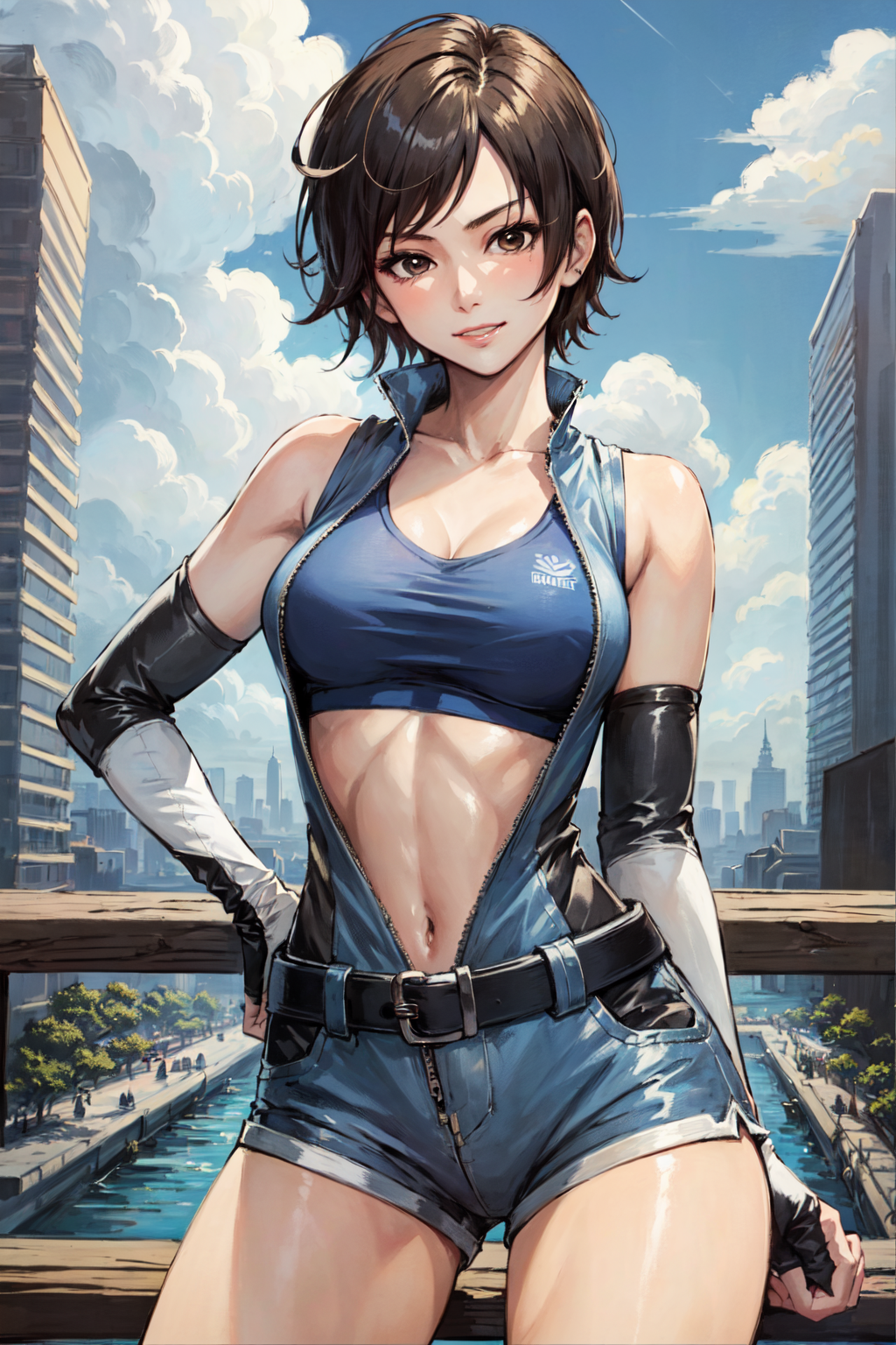 Asuka Default: kazama asuka, 1girl, open jumpsuit , sports bra, shorts, belt, sleeveless, elbow gloves,