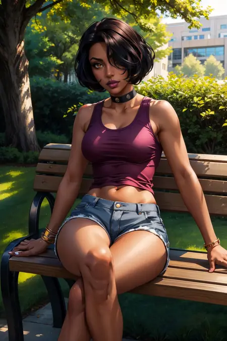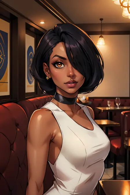 캐릭터 태그: 립스틱, 한쪽 눈을 가리는 머리카락, 메이크업, 어두운 피부
