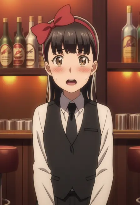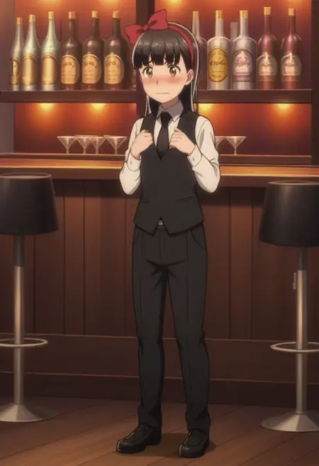 bartender uniform, hair bow, hairband, black necktie, white shirt, black vest, black pants,