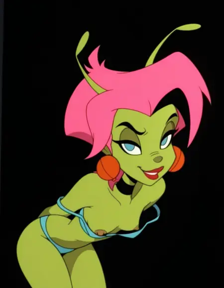 xpetrax, green skin, pink hair, short hair, antennae, blue eyes, red lips, no pupils