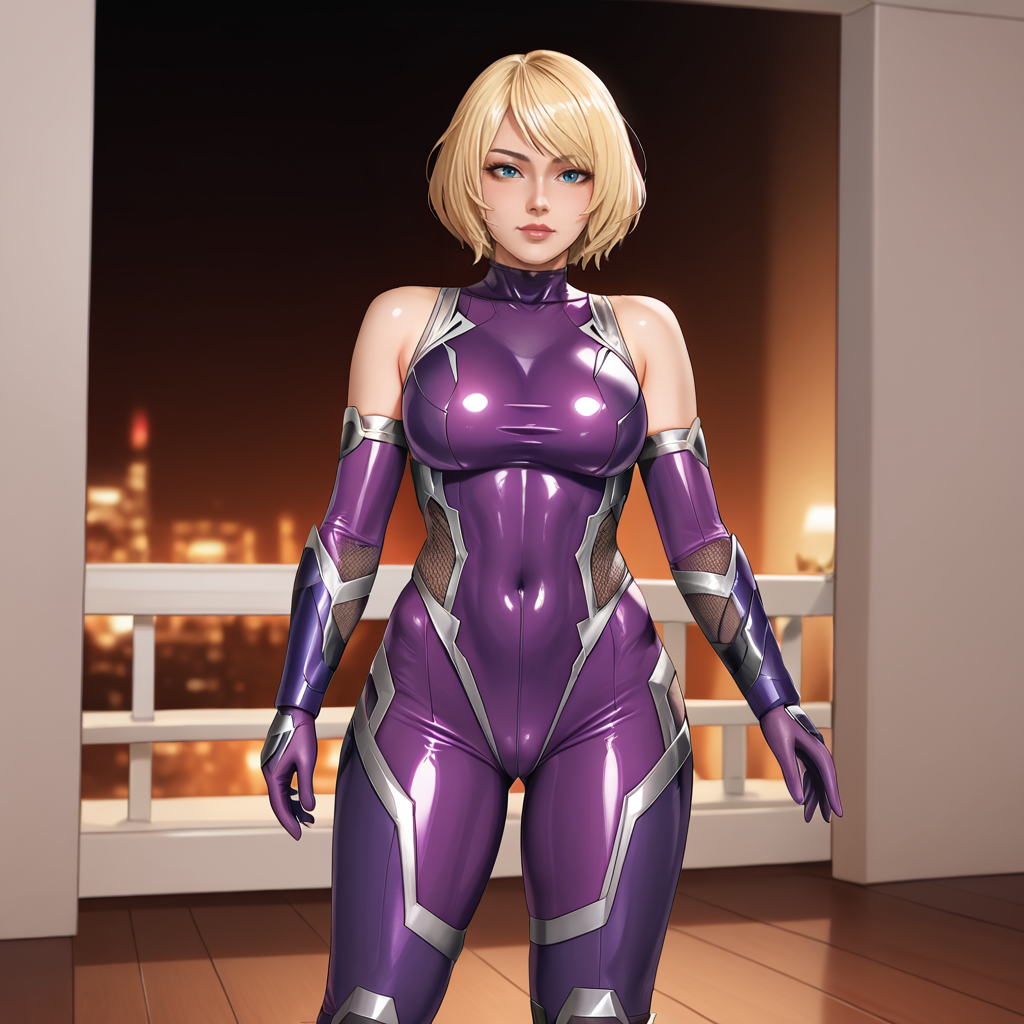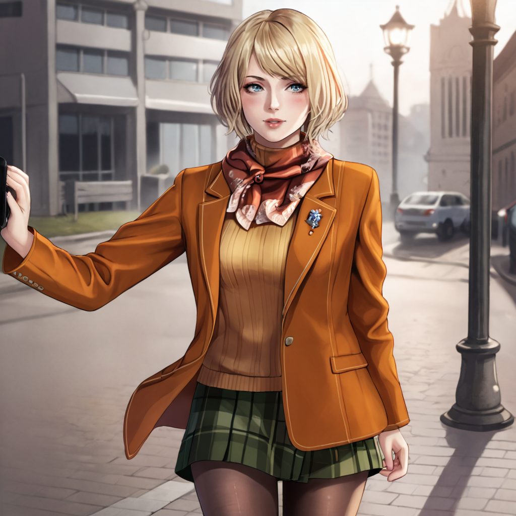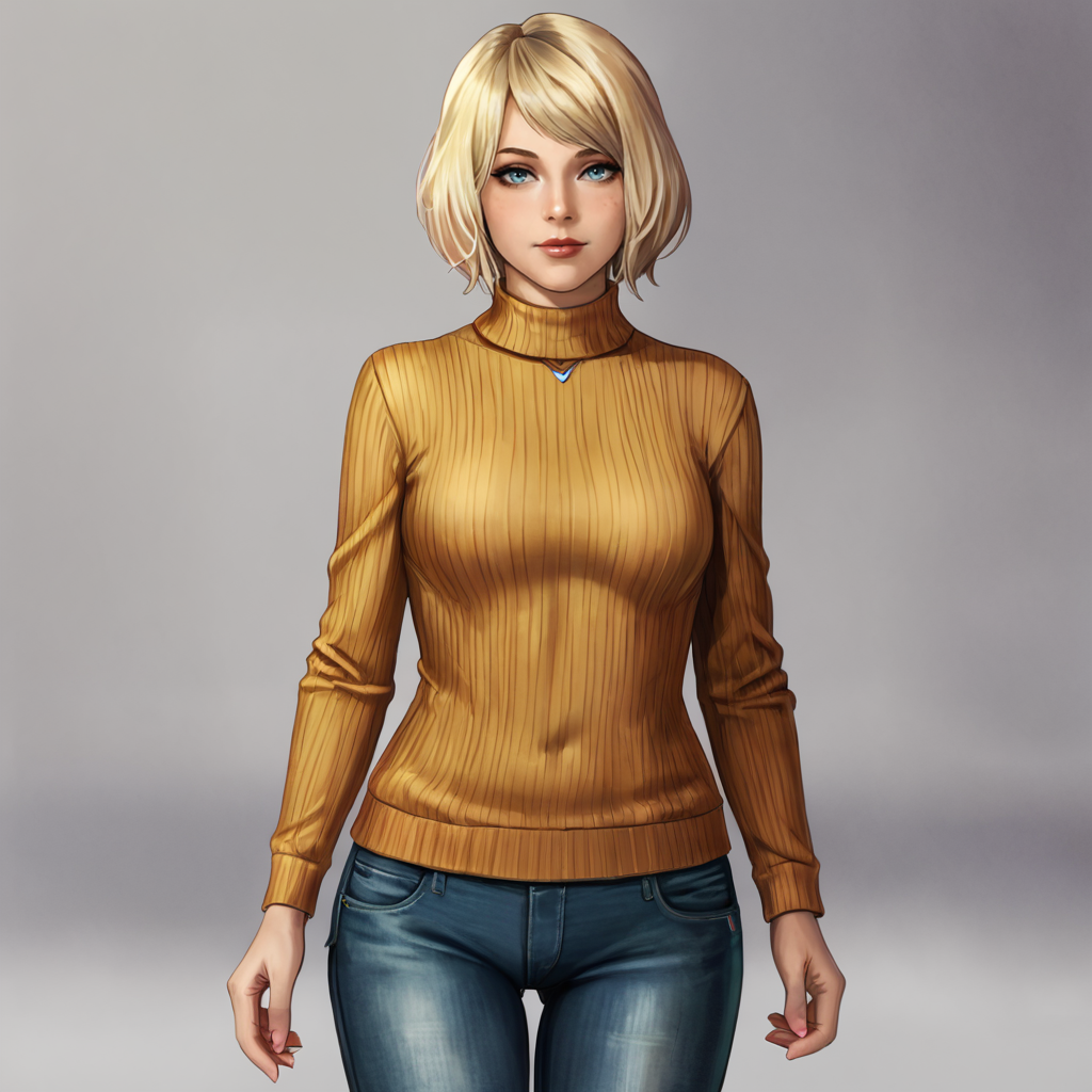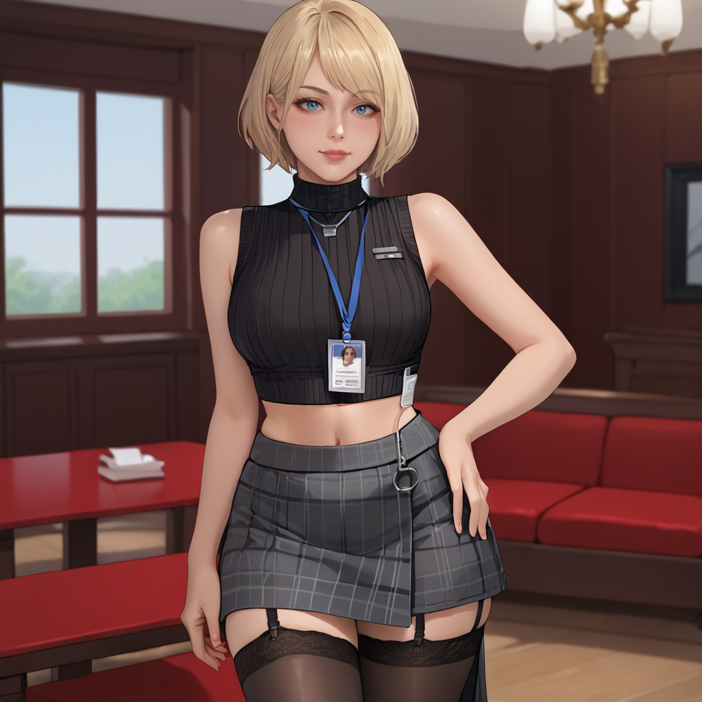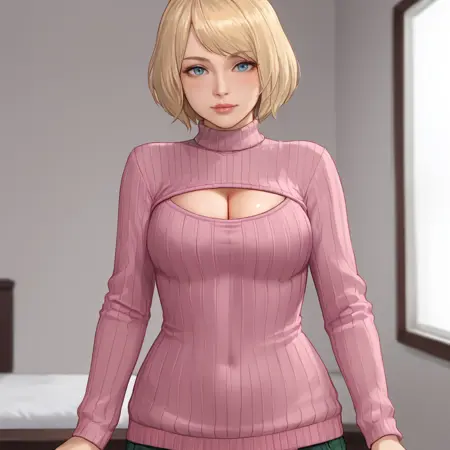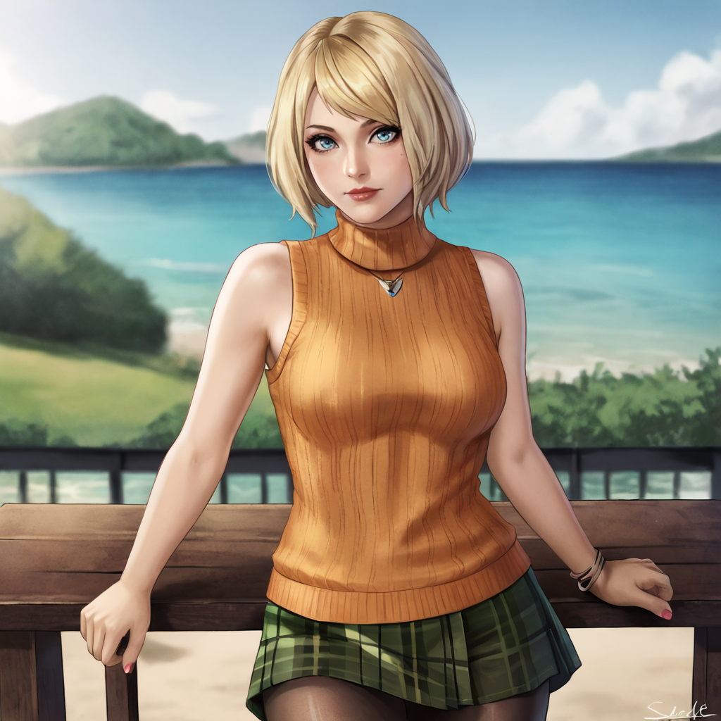 触发词:Ashley, 1girl, 短发, 金发, 无袖高领衫, 橙色上衣, 格子裙, 蓝眼睛, 连裤袜, 嘴唇, 饰品, 波波头, 手镯, 裸露肩膀, 毛衣, 西部镜头