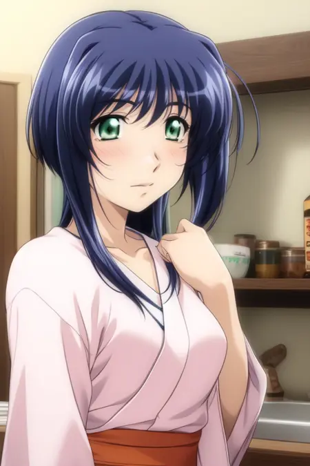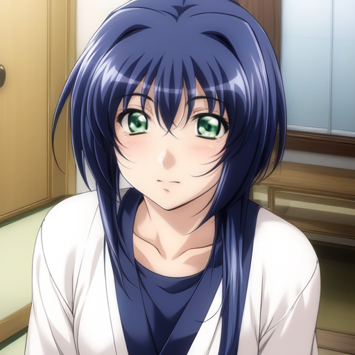 Sagara Emiru, green eyes, dark blue hair, short hair, long hair in back, mullet,