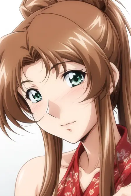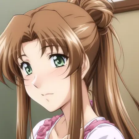 Sagara Maria, green eyes, brown hair, beauty mark, long hair, hair bun