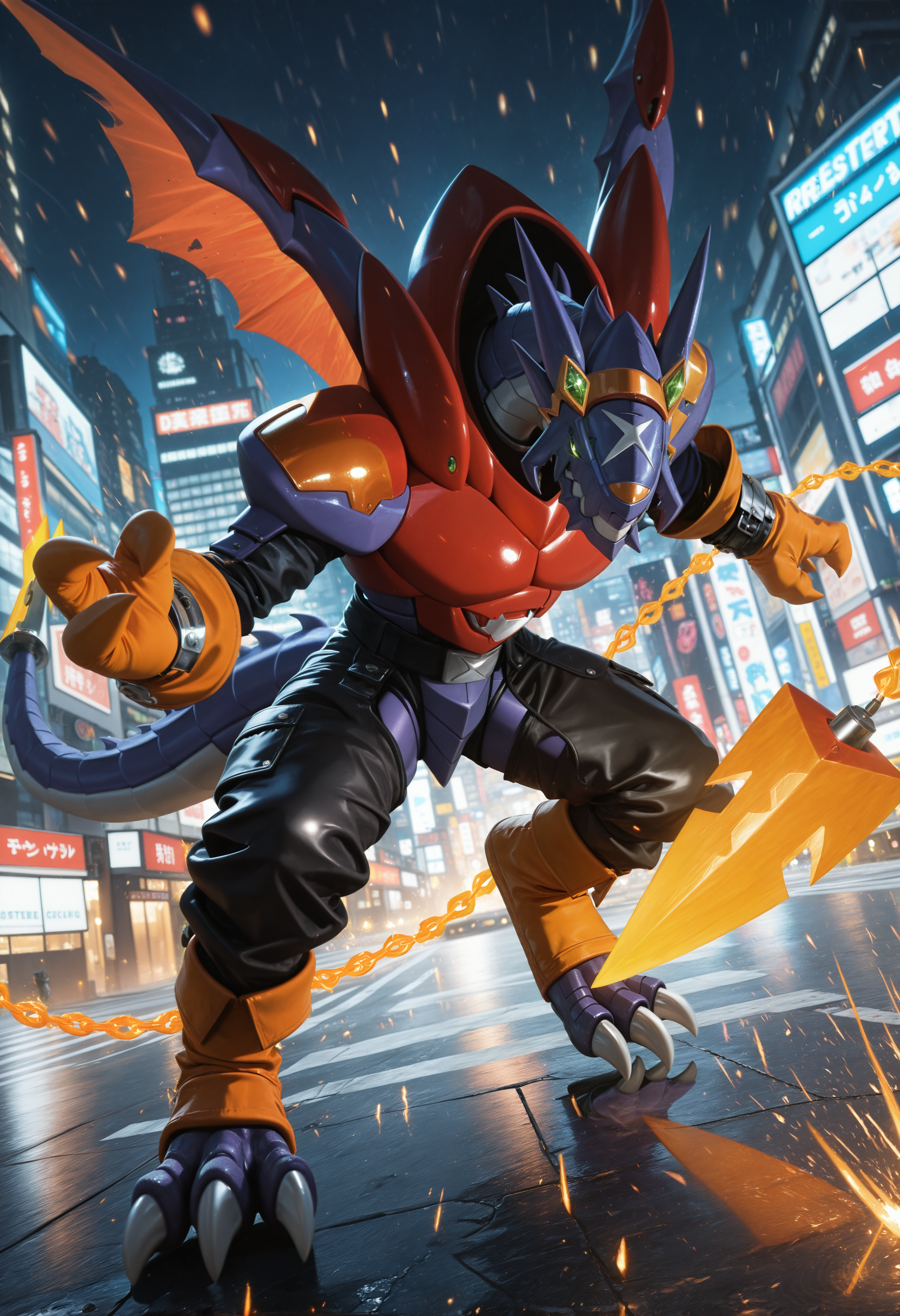 📝 アレスタドラモン は、ガムドラモンから進化したチャンピオンレベルのドラゴン型デジモンです。筋肉質な体躯、赤い鎧、重いアンカー状の尾を持ち、近接戦闘とチェーン攻撃に特化しています。素早く、決断力があり、正義感に満ちています。衝動的に行動することが多いですが、仲間には忠実です。