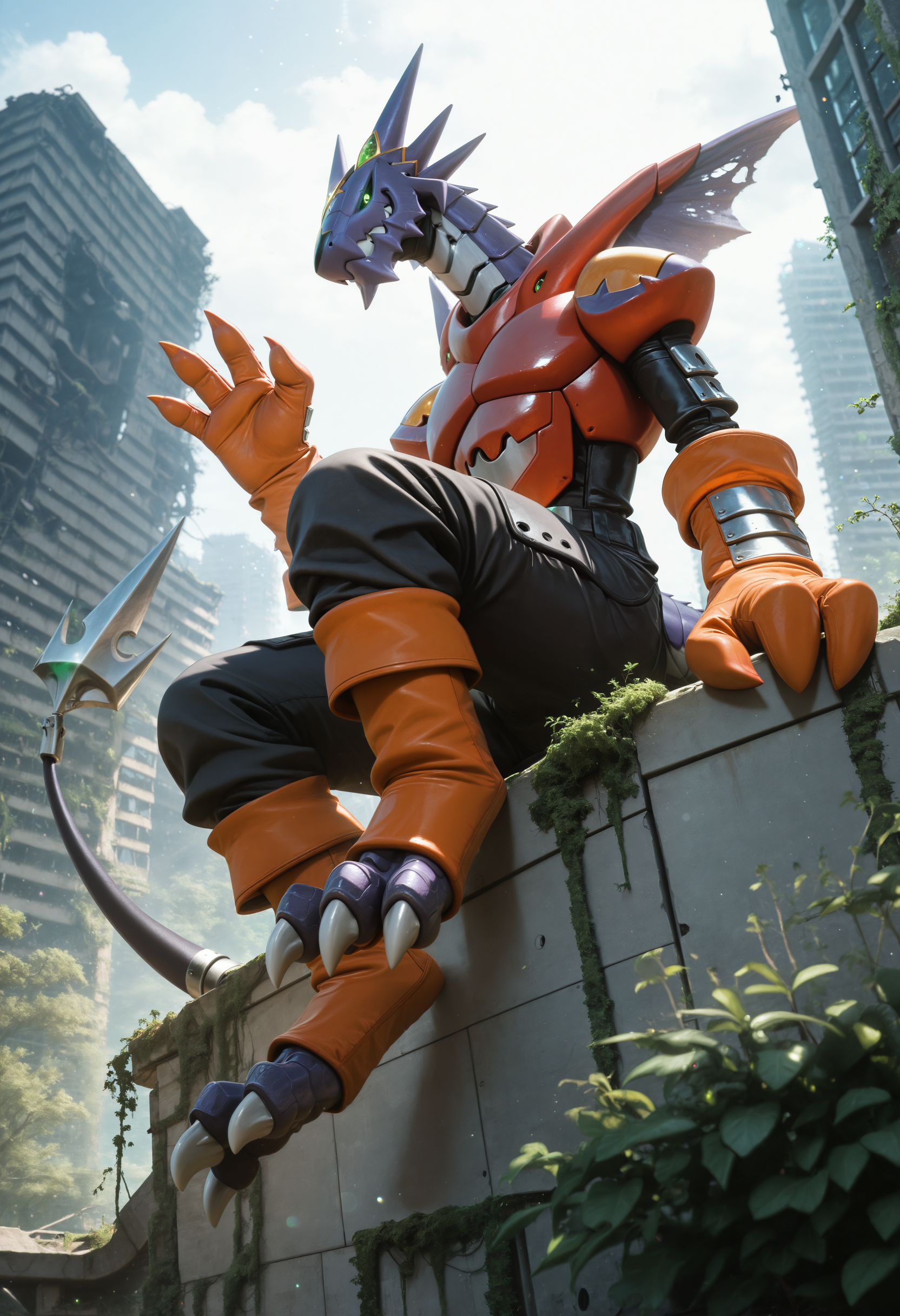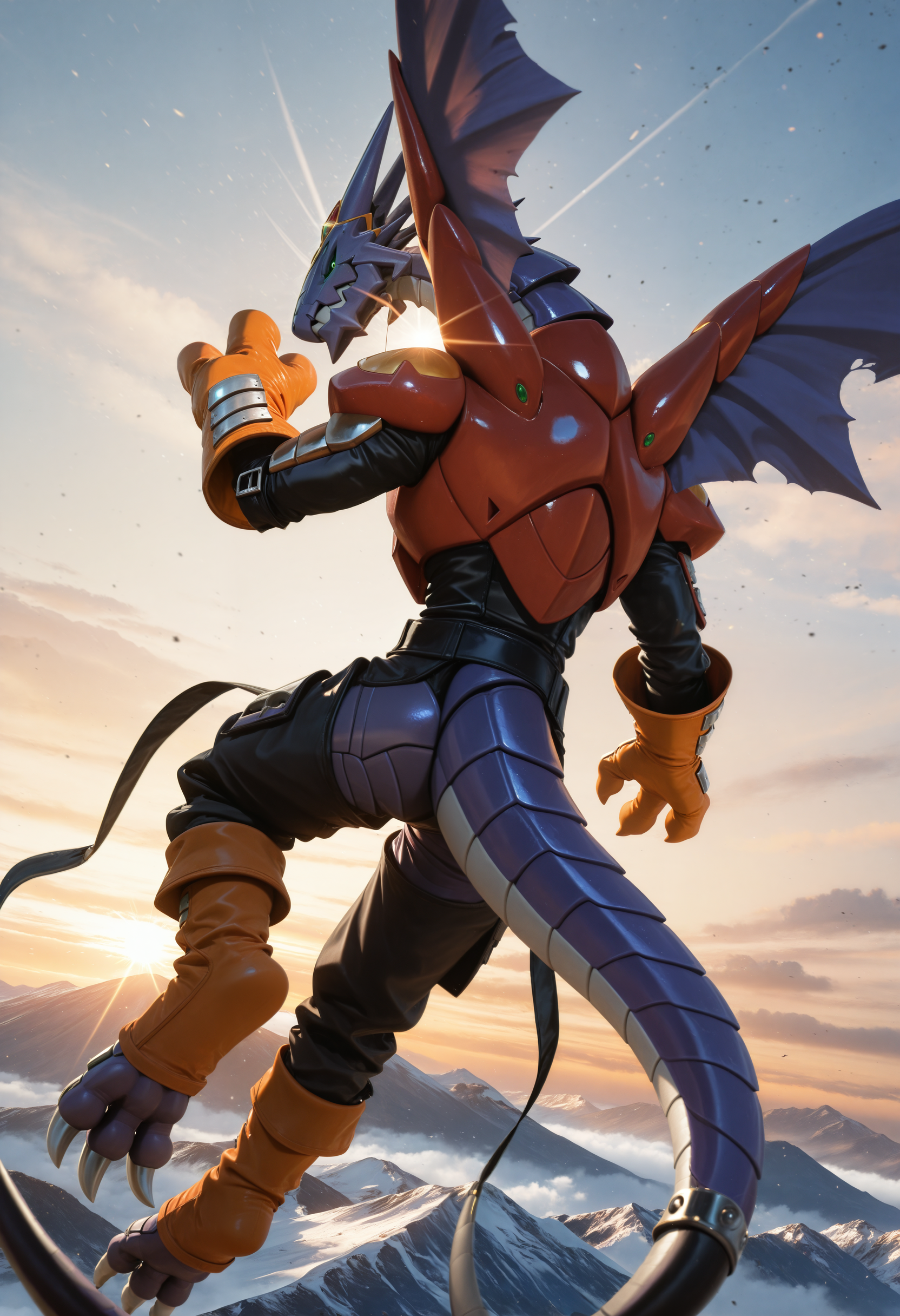 // Illustrious: arresterdramon, dragon, scalie, digimon, digimon (creature), solo, no humans, tail, orange gloves, red armor, wings, 1boy, male focus, green eyes, glowing eyes, toeless boots