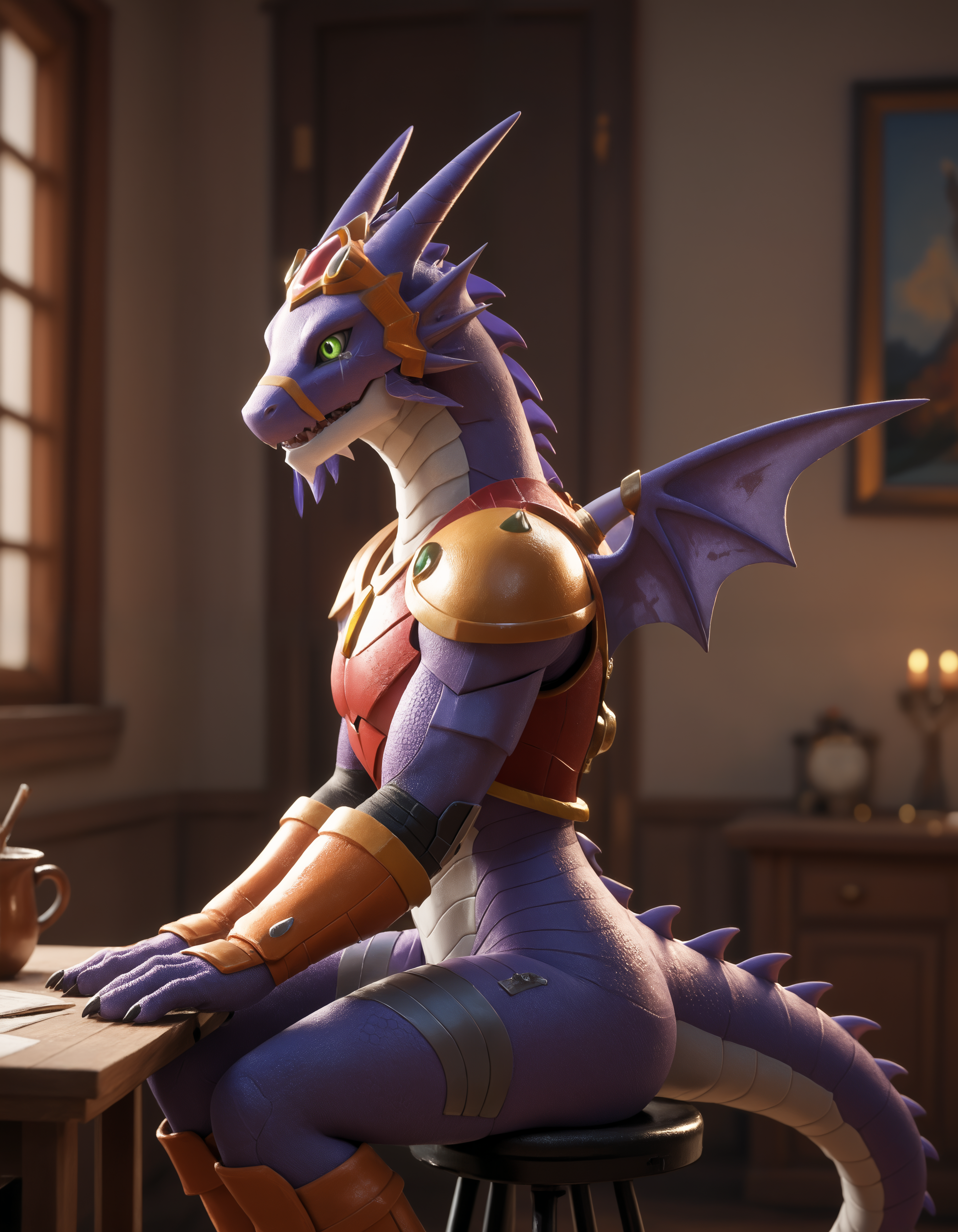 // Pony: arresterdramon, digimon (species), dragon, scalie, wings, tail, orange gloves, green eyes, purple body, red vest armor